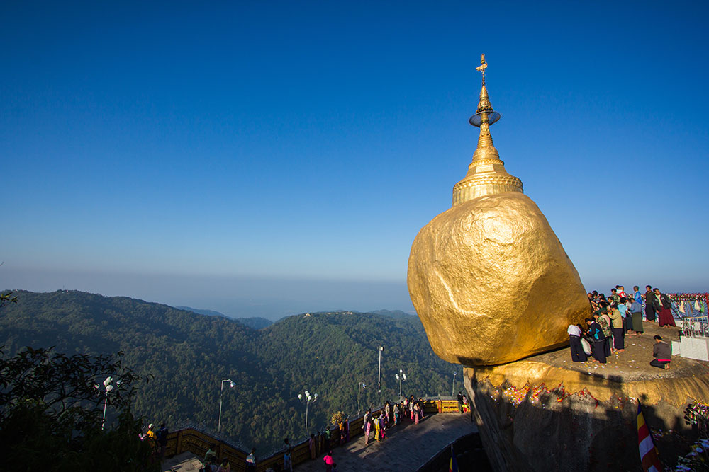 En fin de matinée, arrivée au camp de base de Kyaiktiyo (environ 4/5 heures). Puis route sur la plate formes arrière d'un camion le long d'un parcours sinueux (45 minutes) puis vous ferez une courte promenade de cinq minutes autour du Rocher D’or. Un énorme rocher couvert de feuille d'or et tenant délicatement en équilibre sur le bord d'une falaise, Selon la tradition, le rocher aurait été placé à cet endroit par deux "nats" (esprits) il y a 2 500 ans ; il ne tiendrait que par un fil, un des cheveux du Bouddha..Le Rocher D’or est l'un des principaux lieux de pèlerinage de la Birmanie. Et de nombreux bouddhistes à travers le pays viennent ici pour rendre hommage. Nuit à proximité du Rocher D’or.