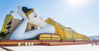 Après le déjeuner, nous allons visiter la pagode Kyaukhtatgyi qui abrite une statue du Bouddha couché de 70 mètres de long. Une visite à Kyaukhtatgyi offre un bon aperçu du bouddhisme avec des peintures murales représentant la vie du Bouddha. Vous observerez les pieds de la statue sculptées avec des symboles traditionnels et vous remarquerez souvent de nombreux habitants venir s'y recueillir pour rendre hommage et prier.