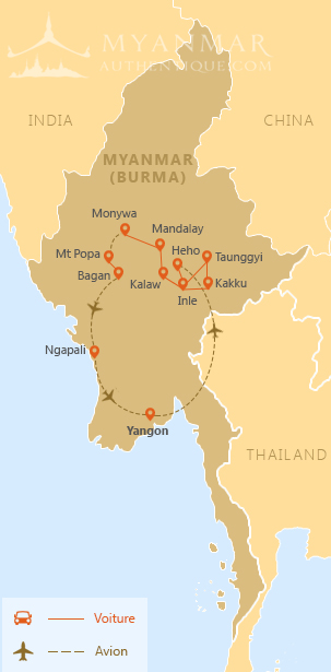 Yangon - Lac Inle - Tanggyi - Kakku - Kalaw - Pindaya - Mandalay - Monywa - Popa - Bagan- Ngapali - Yangon
